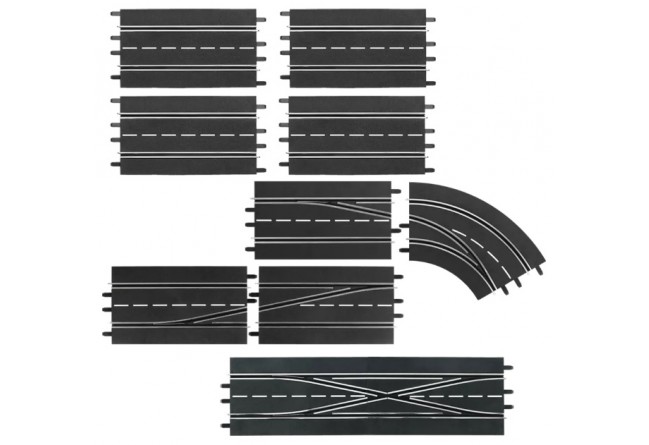 Contenu de l'emballage : 4 lignes droites standard, 1 aiguillage (gauche), 1 double aiguillage, 1 courbe de changement de voie (droit...
