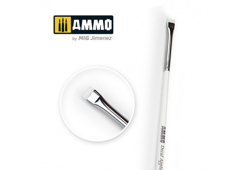 Brosse d'application de décalcomanies AMMO Mig Jimenez fabriquées à partir de poils de la plus haute qualité, protégeant à la fois la peinture du modèle et les décalcomanies elles-mêmes.
