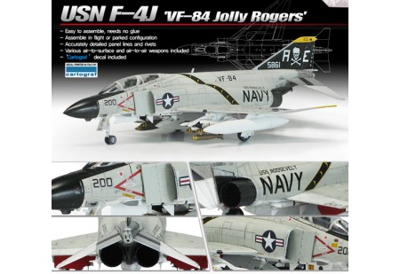 USN F-4j Phantom VF-84 Jolly Rogers 1/72. Maquette à monter avec lignes de structure et rivets très fins. Cockpit et train rentrant finement reproduits, inclus Décals Cartograf de haute qualité. La maquette permet de monter un avion en vol ou parqué au so...