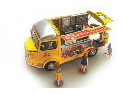 Version Food truck Crêperie avec aménagements intérieurs, vaisselle, denrées, four, caisse enregistreuse, crêpières, vitrine, porte-menu, magazines, affichettes et trois figurines (vendeuse et deux jeunes clientes)....