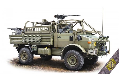 Le JACAM Unimog des Forces Spéciales de l'Armée Belge est équipé d'un anneau circulaire monté à l'arrière du personnel de cabine, qui peut être armé d'une mitrailleuse de 12,7 mm. À l'avant, le commandant de siège est équipé d'un bras oscillant pour mitra...
