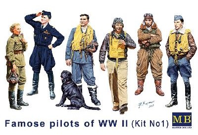 Ensemble de 7 figurines en plastique. Pilotes représentés: Werner Mölders (Luftwaffe), Saburo Sakaï (Marine Impériale Japonaise), James Johnson (Royal Air Force), Lidia Litviak (Forces Aériennes Soviétiques), Richard Bong (USAF), Marcel Albert (Normandie ...