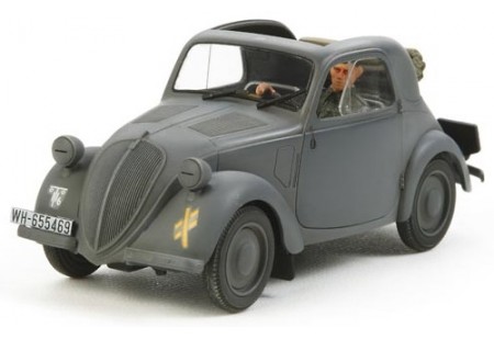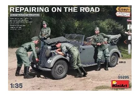 Ensemble représentant un véhicule d’état-Major Allemand en panne, quelque part, sur une route de Normandie en 1944. Le kit du véhicule et 4 figurines en plastique sont inclus dans la boite....