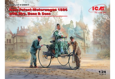 L'ensemble comprend 76 pièces en plastique et 12 pièces photogravées pour l'assemblage d'un kit plastique Benz Patent-Motorwagen 1886, et 31 pièces pour l'assemblage de 3 figurines - Mme Benz & Sons....