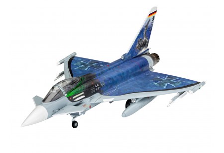 Modèle réduit de l'Eurofighter à la décoration spectaculaire. Le code binaire vert représente le La numérisation de l'armée de l'air, les polygones bleus pour le corporate design de la Bundeswehr. Le site Quadriga pointe du doigt les Eurofighters de la dé...