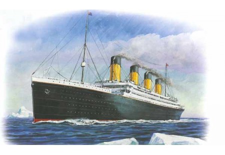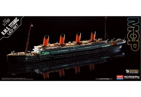 Maquette du Titanic à l'échelle 1/700, dont la coque est peinte d'origine dans sa partie inférieure; certaines pièces sont déjà peintes sur le pont (MCP = Multi Color Parts), rendant inutile la mise en peinture.