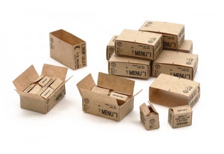 Cette planche cartonnée à découper permet de réaliser par pliage 8 cartons de rations MCI, fermés ou ouverts dévoilant les rations qui y sont stockées. Le parfait complément a...
