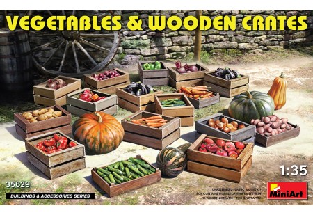 La boîte contient des modèles de légumes et des caisses en bois...