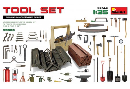 Le kit comprend des modèles d'outils à l'échelle 1/35 : sabre, lime, scies, marteaux, haches, pinces, pelles, pieds de biche, bidons d'huile, brûleurs à gaz, extincteur, luminaire, clés, tournevis, boîtes à outils....