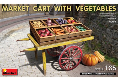 La boîte contient un modèle de chariot avec des légumes et des caisses en bois...