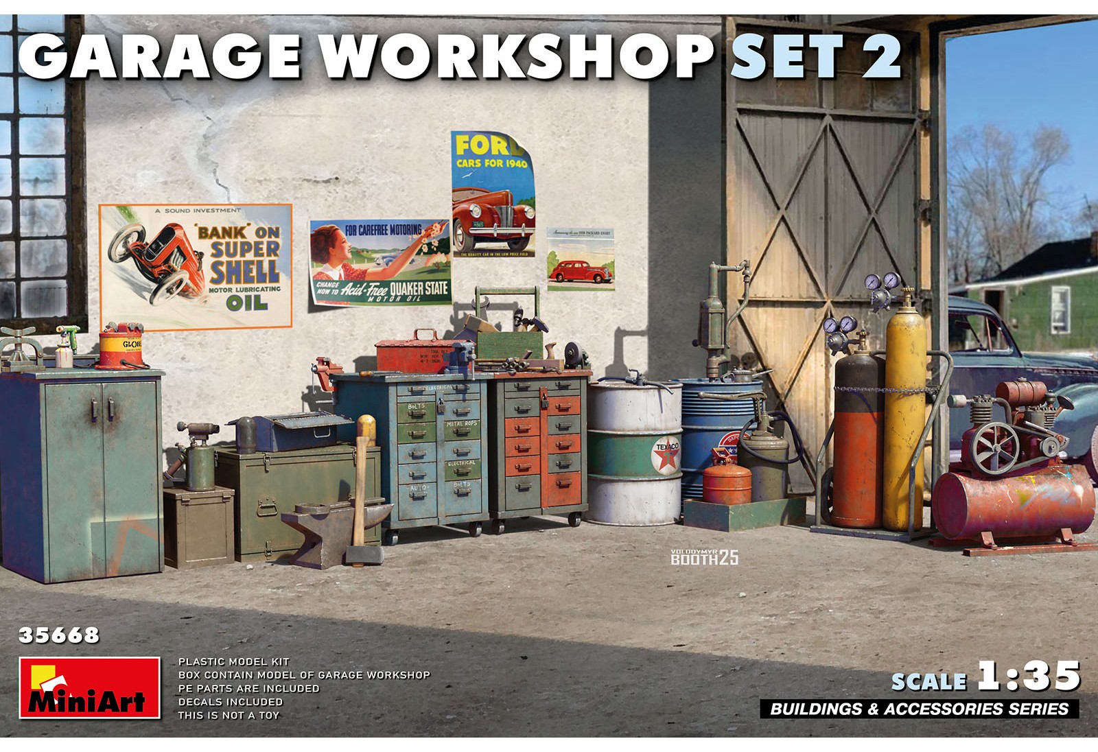 Kit idéal pour tout diorama civil ou militaire, cet atelier apporte détails authentiques et réalisme à vos scènes. Il est rempli d'outils, d'armoires de rangement, de compresseurs, de bidons d'huile, de matériel de soudage et bien plus encore.