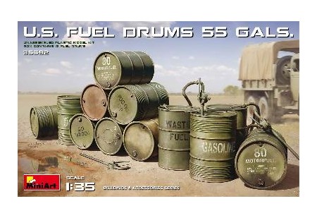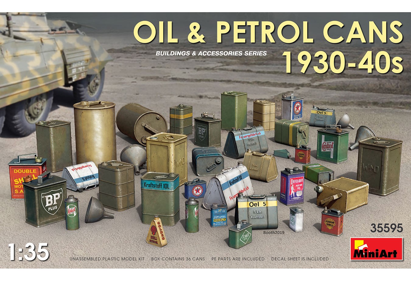 Le kit contient des modèles en plastique de bidons d'huile et d'essence des années 1930-1940.