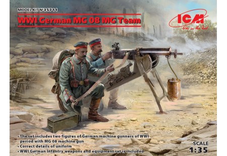 L'ensemble comprend 19 pièces pour l'assemblage de deux figurines de mitrailleurs allemands de la période de la Première Guerre mondiale,