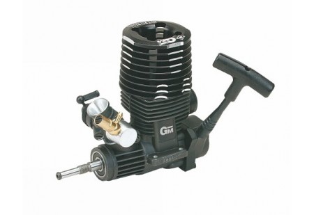 Moteur à échappement arrière avec démarreur à tirette et carburateur à tiroir à 2 pointeaux.