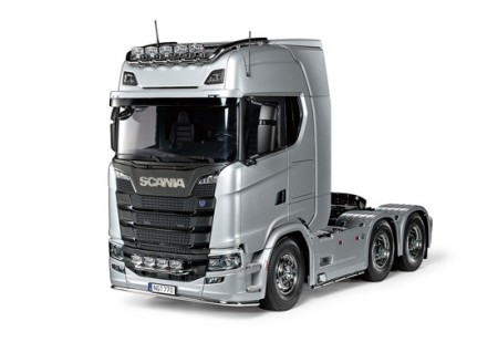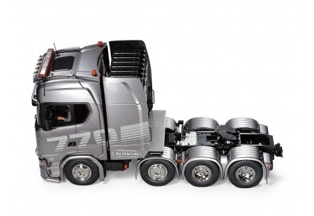 Edition spéciale du tracteur RC Scania R370 (56318) avec pièces de cabine pré-peintes en Aluminium brillant TS-17 puis recouvertes de vernis polyuréthane pour obtenir un brillant profond et durable.