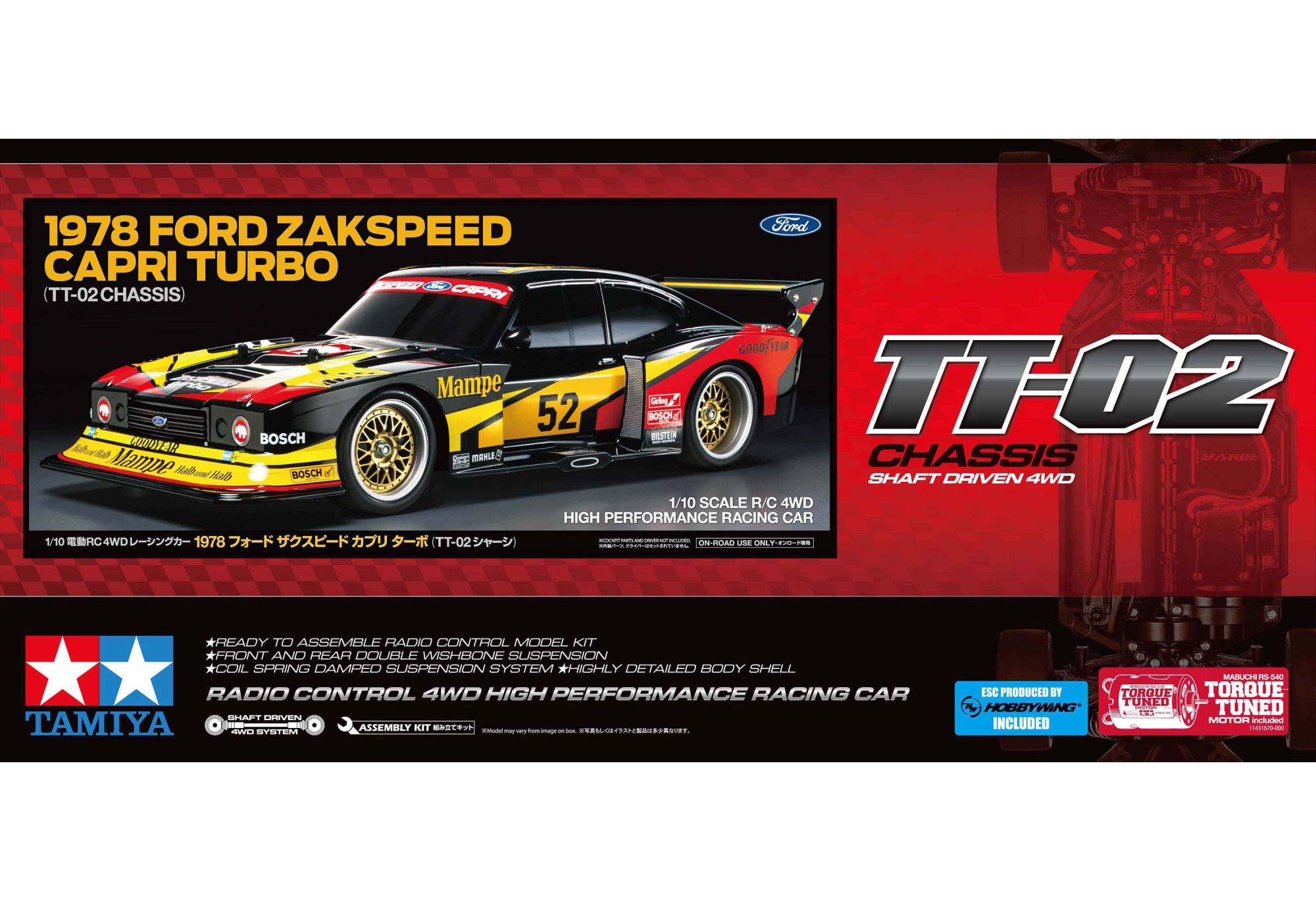 Tamiya présente une nouvelle réplique de voiture de compétition associée au châssis TT-02 : la Ford Zakspeed Capri Turbo 1978. Conçue pour le DRM (Deutsche Rennsport Meisterschaft) en 1978 par l’équipe ouest-allemand...