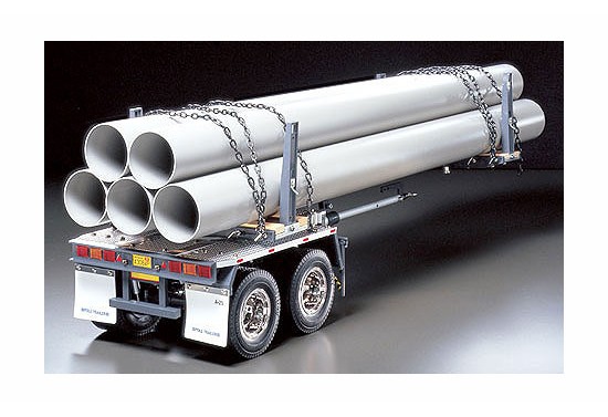 La semi-remorque extensible est capable de transporter des tubes de longueur variable grâce à son support déplacable. La remorque est en aluminium, avec 4 roues détaillées. 5 tubes de longueur 75cm et de diamètre 55mm sont inclus dans le kit.