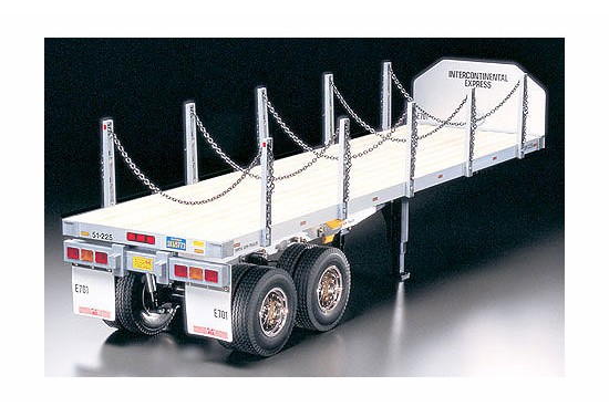 Tamiya propose une nouvelle semi-remorque qui peut être associée aux tracteurs 1/14. Ce plateau est composé d'une plateforme en bois, de longerons alu, et de supports alu avec des chaines, qui donnent un aspect très réaliste à ce modèle.