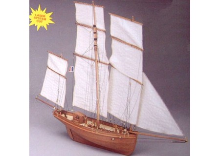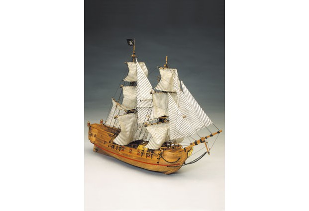Brigantine corsaire du capitaine Kidd. Construction tout bois par couples et listeaux. Accastillage inclus dans la boîte comprenant: poulies et caps de mouton en buis, canons, piliers de rambardes et colonnettes en laiton tourné. Fils pour gréement. Figur...
